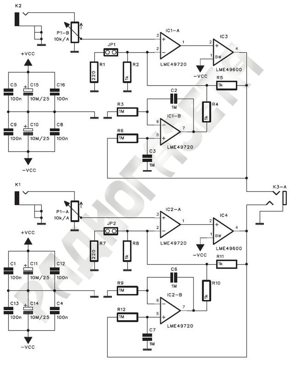 Так как оба канала идентичны, рассмотрим работу одного из них. Входной сигнал поступает через разъём К2 на регулятор громкости P1. С движка потенциометра сигнал подаётся на неинвертирующий вход операционного усилителя IC1A, к выходу которого подключен драйвер LME49600 IC3. Резисторы R5, R1, R2 образуют цепь общей отрицательной обратной связи и определяют коэффициент усиления схемы.