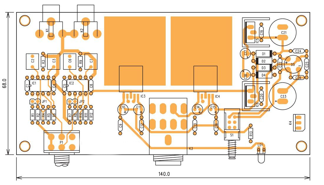 Усилитель выполнен на двусторонней печатной плате размерами 68 х 140 мм. (скачать чертёж печатной платы в формате SLayout). Расположение элементов показано на рисунке: