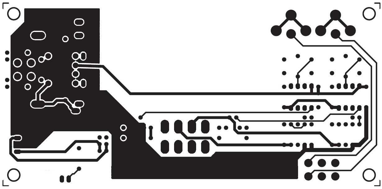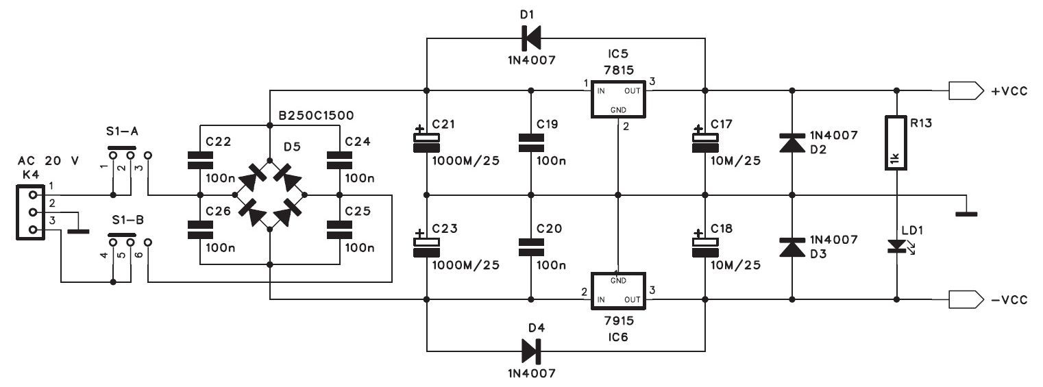 В правой части расположены элементы блока питания. Сетевой трансформатор располагается за пределами печатной платы и крепится либо к корпусу, либо к отдельной плате.