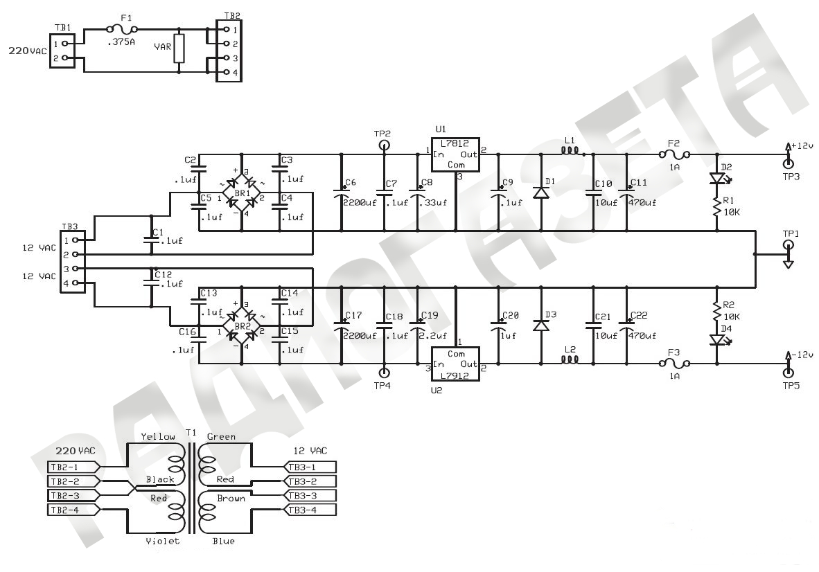 Блок питания обеспечивает на выходе напряжения ±12В при нагрузке до 1А. Его схема представлена на рисунке: