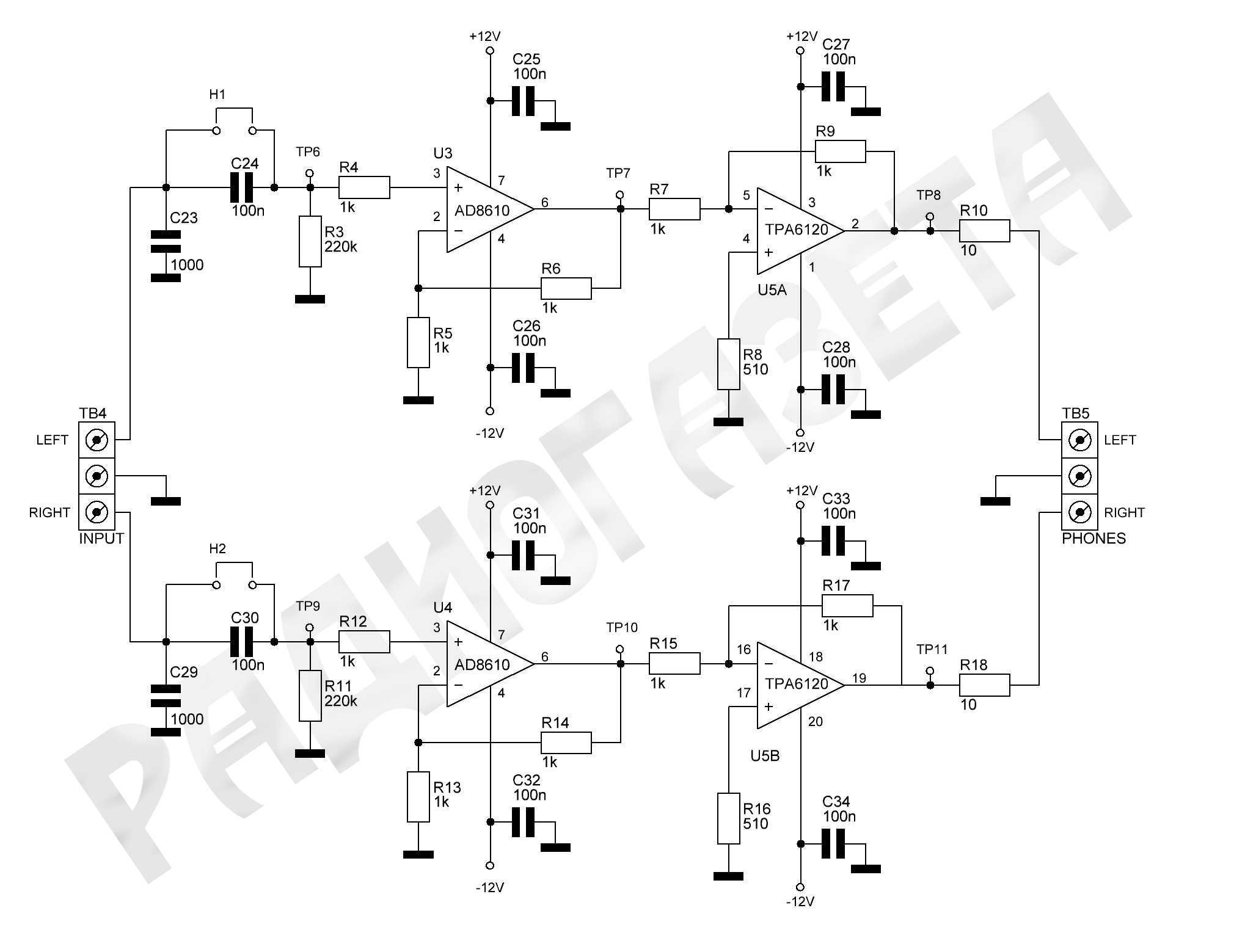 Принципиальная схема прецизионного усилителя для наушников представлена на рисунке: